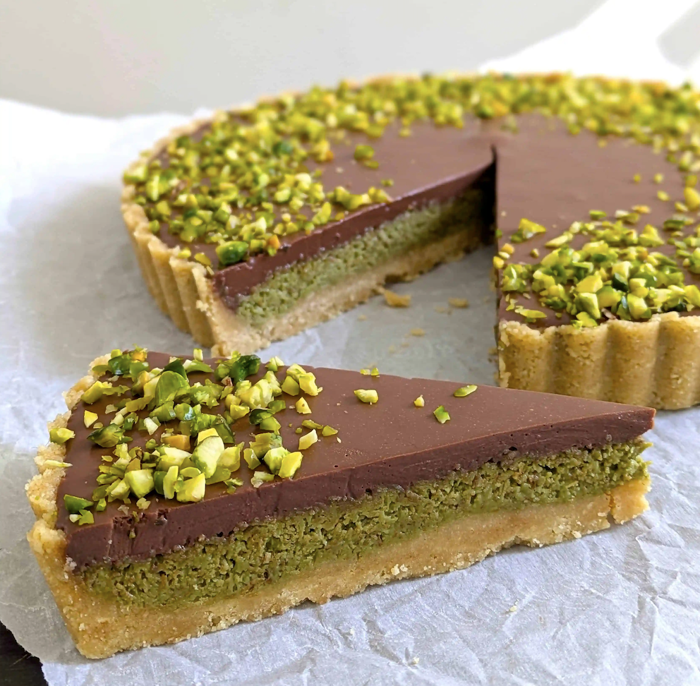 A rich dark-chocolate tart infused with Middle Eastern spices and topped with gold accents—our Dubai Chocolate Tart is pure luxury in every bite.